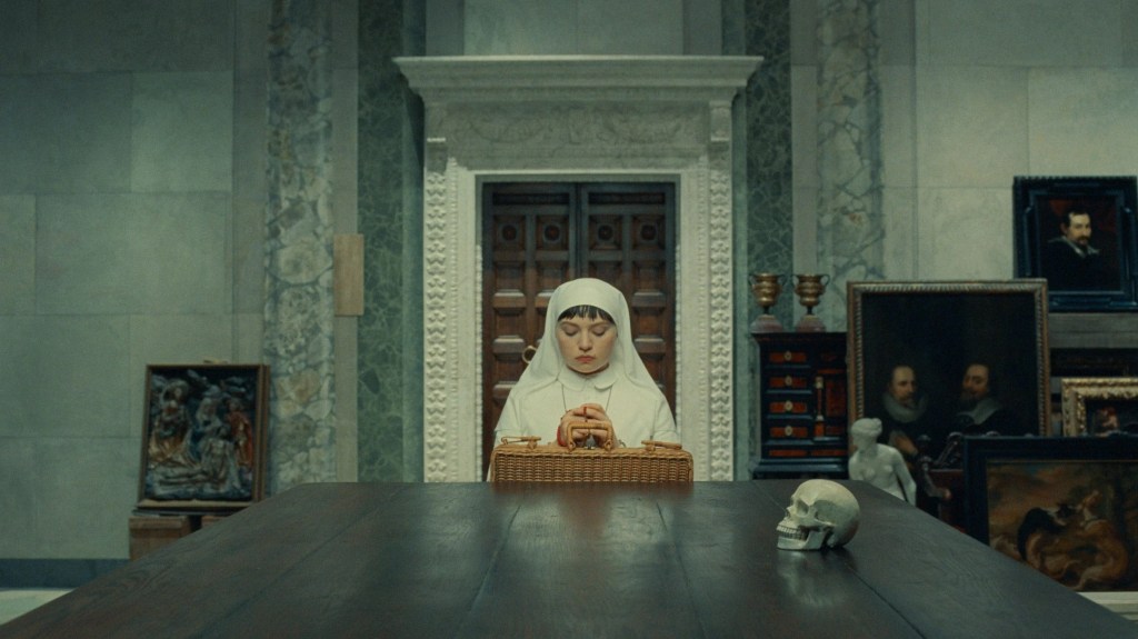 Moreover, Anderson’s set design is also extremely individual and unusual. He successfully creates a vision of a two-dimensional world; this mirrors the notion that cinema is artistry. His designs in ‘The Phoenician Scheme’ are intricate and place a large focus on attention to detail, from the wallpaper to furniture, props, and costumes. He builds his fictional worlds into real-life settings, for example, the scene in the desert. This is a unique way of locating film scenes because most scenes are shot in real-life locations or a studio, but he can craft and weave his imagination into life. This makes the shots visually pleasing to witness and indulge in. The use of colours in this film, like green, beige, orange, and grey creates a feeling of nostalgia. Colours of the 70s. The palette used is very eye-catching, yet neutral and charming. These calm, soft and subtle colours could mirror the life that Zsa-Zsa Korda and Sister Liesl were destined to have.